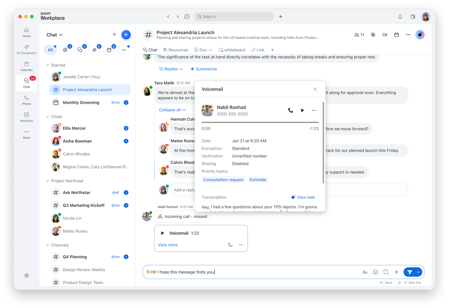 Continuous meeting chat is just one example of how Zoom Chat serves as a connector across Zoom, threading your interactions together in a central space. If you’re checking your email in Zoom Mail, you can easily share an important message in chat with just a few clicks. If you’re chatting with someone and want to hop on a quick call, just click the video icon to start an impromptu Zoom meeting. When you call a person from Zoom Phone or receive a voicemail from a contact, you can see call logs and voicemails in their 1:1 chat, keeping all the records of your communication in one place.