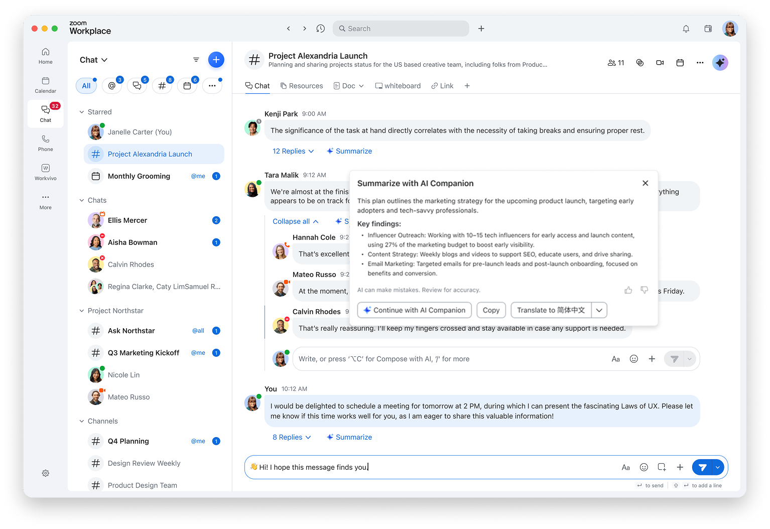 Summarizing and analyzing information is just one of AI Companion’s capabilities. It can also help you cut down on your response times by drafting chat messages with the right tone and length (even on the go using your Zoom Workplace mobile app). And if you’re chatting with a colleague about finding a time to meet, you can use AI Companion to schedule meetings directly from a message.