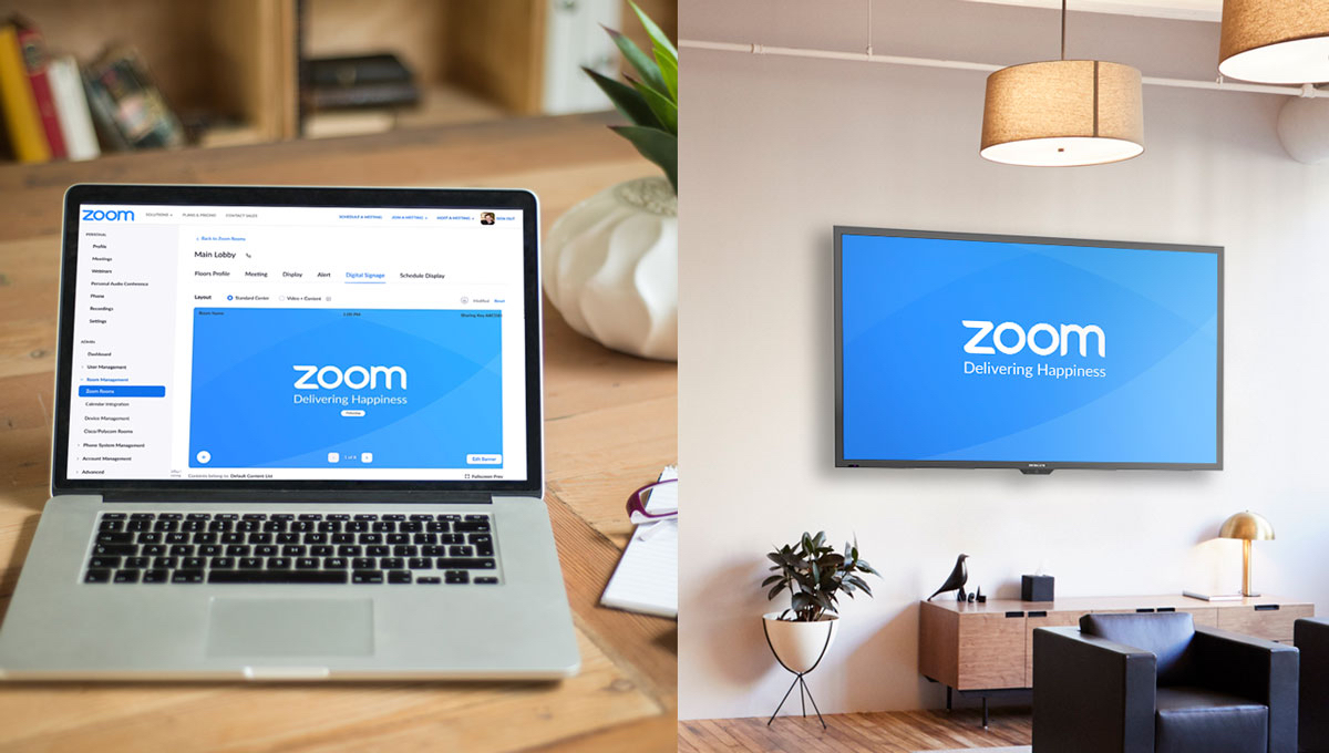 Zoom Rooms Digital Signage can easily be invited into Zoom meetings and configured to auto-answer incoming internal meeting invites. This is a great way to broadcast important meetings or other company-wide events and updates.