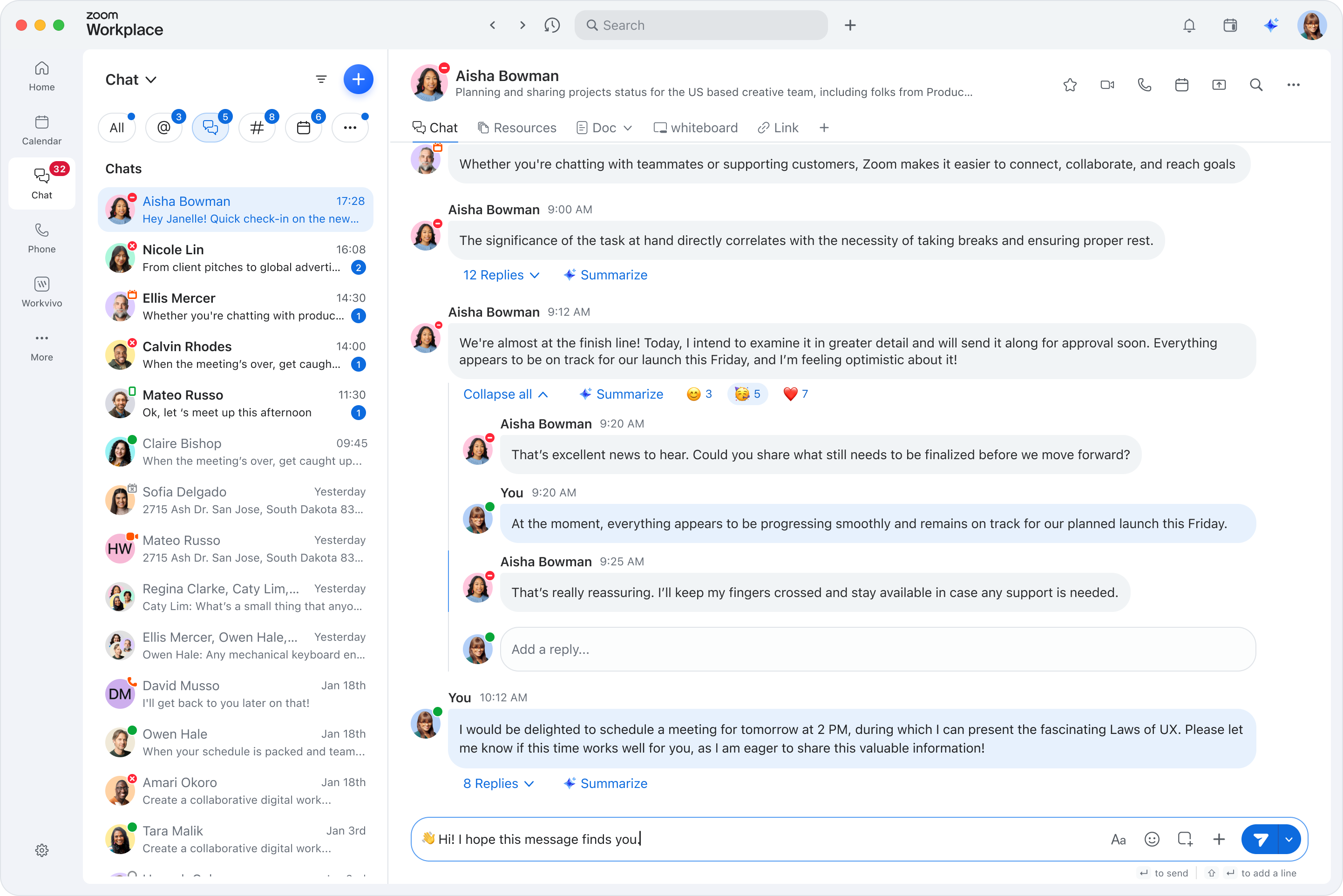 With Zoom Chat, communication is quick and easy — and you can go beyond simple messaging to manage complex projects and automate busywork to focus on what matters. A familiar and flexible experience allows your teams to communicate with internal and external collaborators in one place. Plus, your built-in AI assistant, Zoom AI Companion,* is there to help you summarize chats, compose messages, and prepare for your day, all from a convenient side panel.