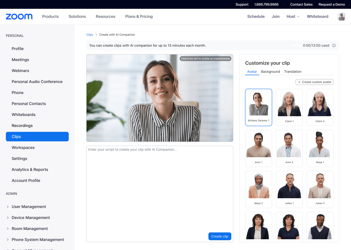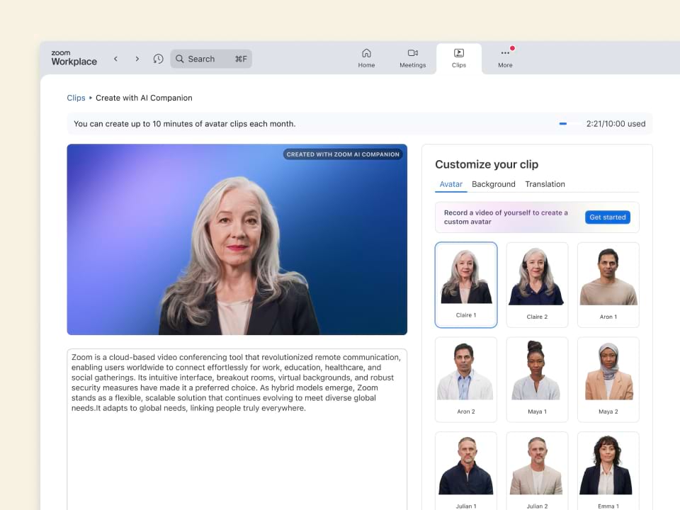 Zoom Clips uses AI to turn messages into polished, custom videos — even in different languages — that are ready to share with teammates or customers. No extra tools or steps needed.