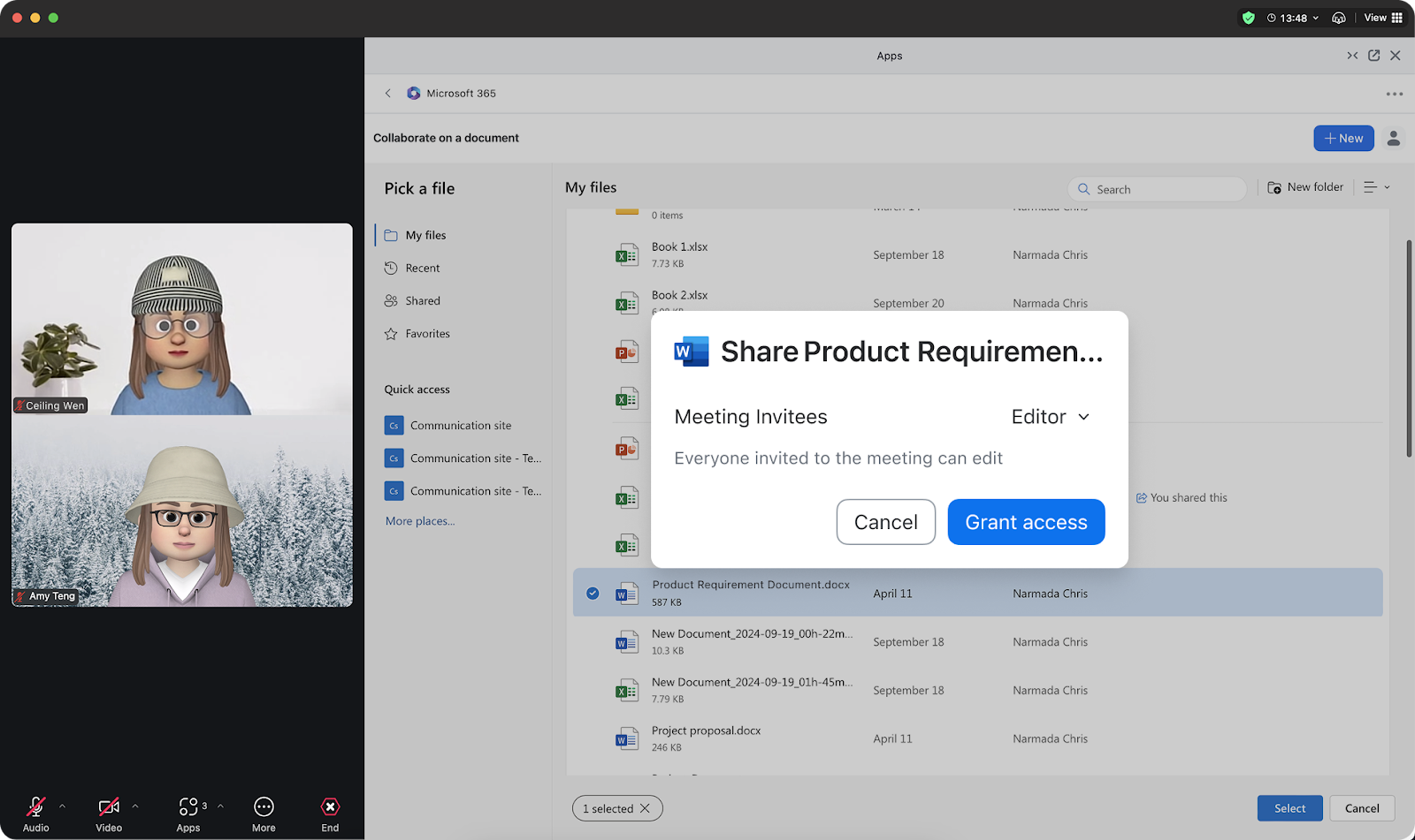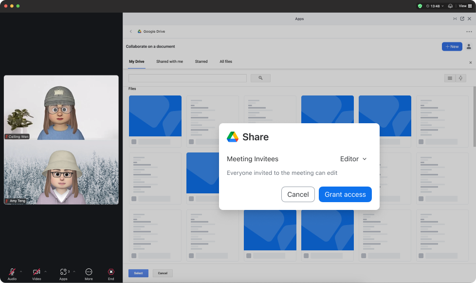 Our new integration enables you to access and manage Drive files easily and directly within the Zoom app. Simply connect your account, open the file picker, and create a new document or select one to share. Links posted in chat will generate a rich file card with key details to show what’s being shared at a glance. You can also adjust permissions on the spot, ensuring everyone in the meeting has the right level of access.