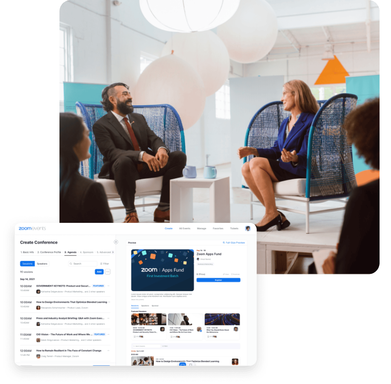 Para empezar a organizar su próximo evento virtual, compre su licencia de Zoom Events y, luego, visite events.zoom.us para iniciar sesión en su cuenta. Una vez que haya iniciado sesión, podrá empezar a configurar su hub en la pestaña Administrar para empezar a crear su primer evento, cumbre o conferencia utilizando la pestaña Crear.