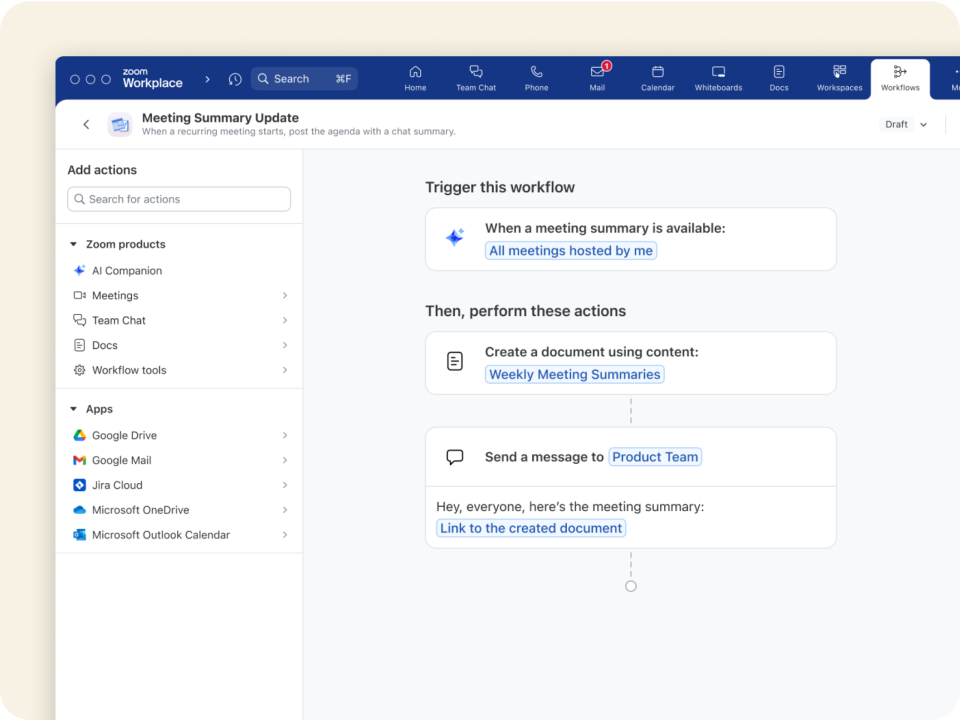 Con Zoom Team Chat, la colaboración se mantiene en un solo lugar, los problemas de TI desaparecen y la IA integrada se encarga del trabajo pesado. Incluido en Zoom Workplace sin coste adicional.