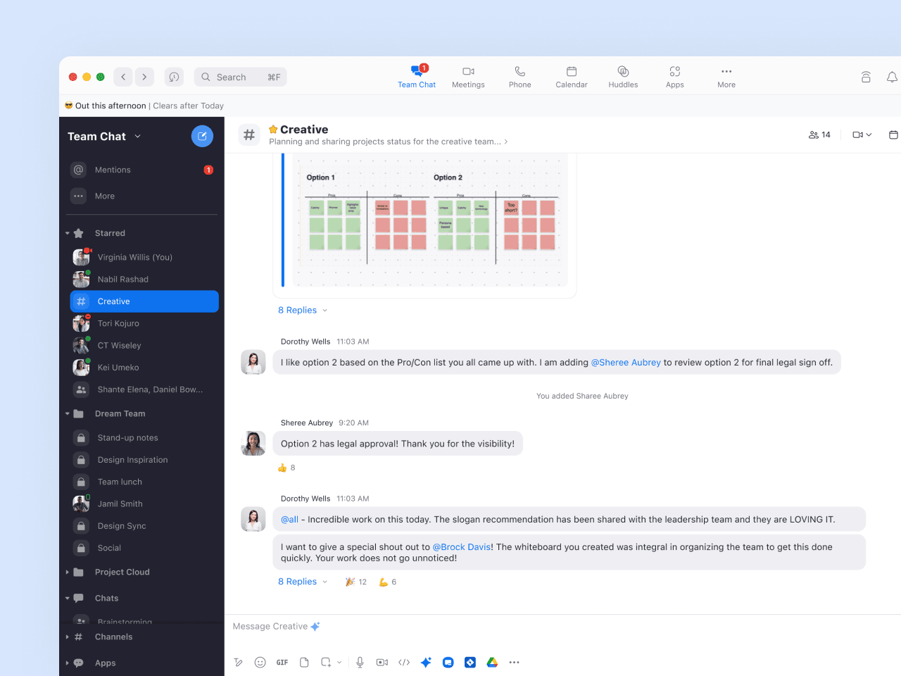 Team Chat serves as the central hub within your Zoom Workplace solution, seamlessly connecting all your collaboration tools. You can quickly transition from chat conversations to video meetings, collaborate on documents, or work together on whiteboards — all without switching between apps. Share content directly into meetings, discuss documents in real time, and capture ideas on virtual whiteboards right from your chat window. With features like starred messages and smart notifications, Team Chat keeps everything organized while maintaining easy access to all your workplace tools, making team collaboration more efficient.