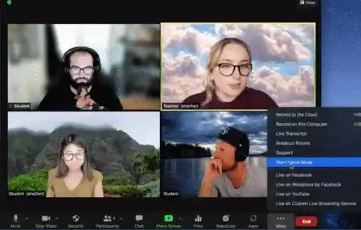 C’est exactement ce que fait le mode Concentration : il aide les participants à rester concentrés pendant les réunions Zoom. Spécialement conçu pour les enseignants, le mode Concentration place les participants à la réunion dans une vue où ils ne peuvent voir qu’eux-mêmes, l’hôte/les co-animateurs et le contenu qu’ils partagent. Dans cette vue, les hôtes et les co-animateurs peuvent également choisir de voir tous les participants simultanément dans la vue Galerie.