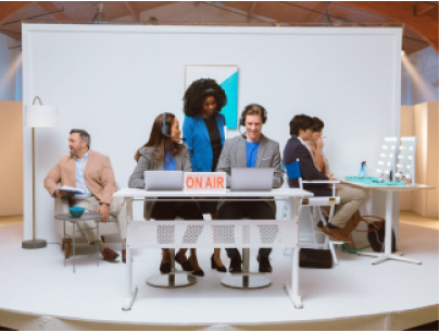Pour les événements hybrides, près de l’intervenant, vous pouvez placer un moniteur sur lequel apparaissent les participants à distance, afin que le public en direct puisse les voir et interagir avec eux.