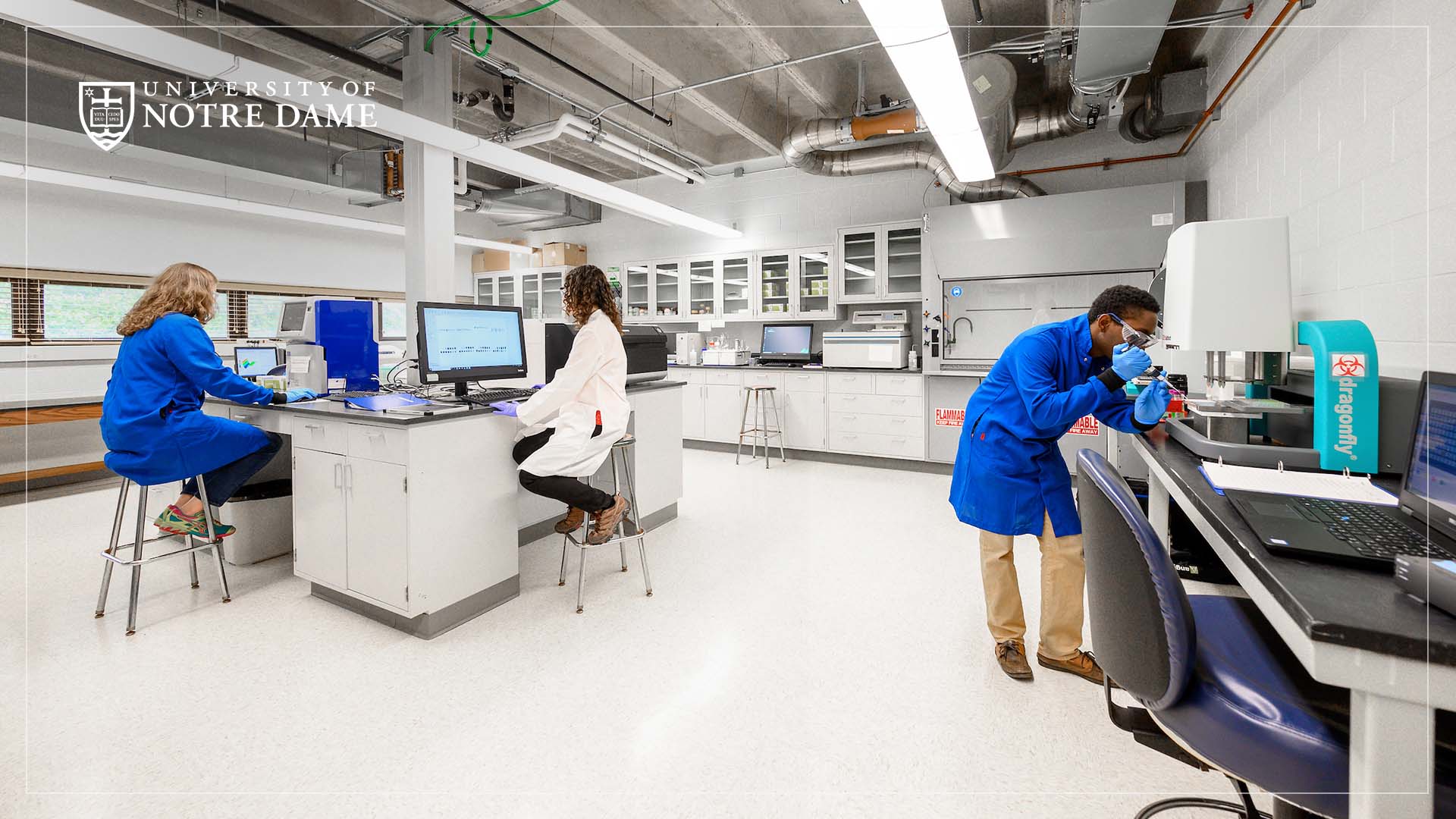 A striking virtual backdrop showcasing two scientists in white lab coats collaborating amid glass beakers and modern equipment in a bright, contemporary laboratory setting. The clean lines and natural lighting create an atmosphere of innovation and focused teamwork, perfect for professional video calls. Suitable for science enthusiasts.
