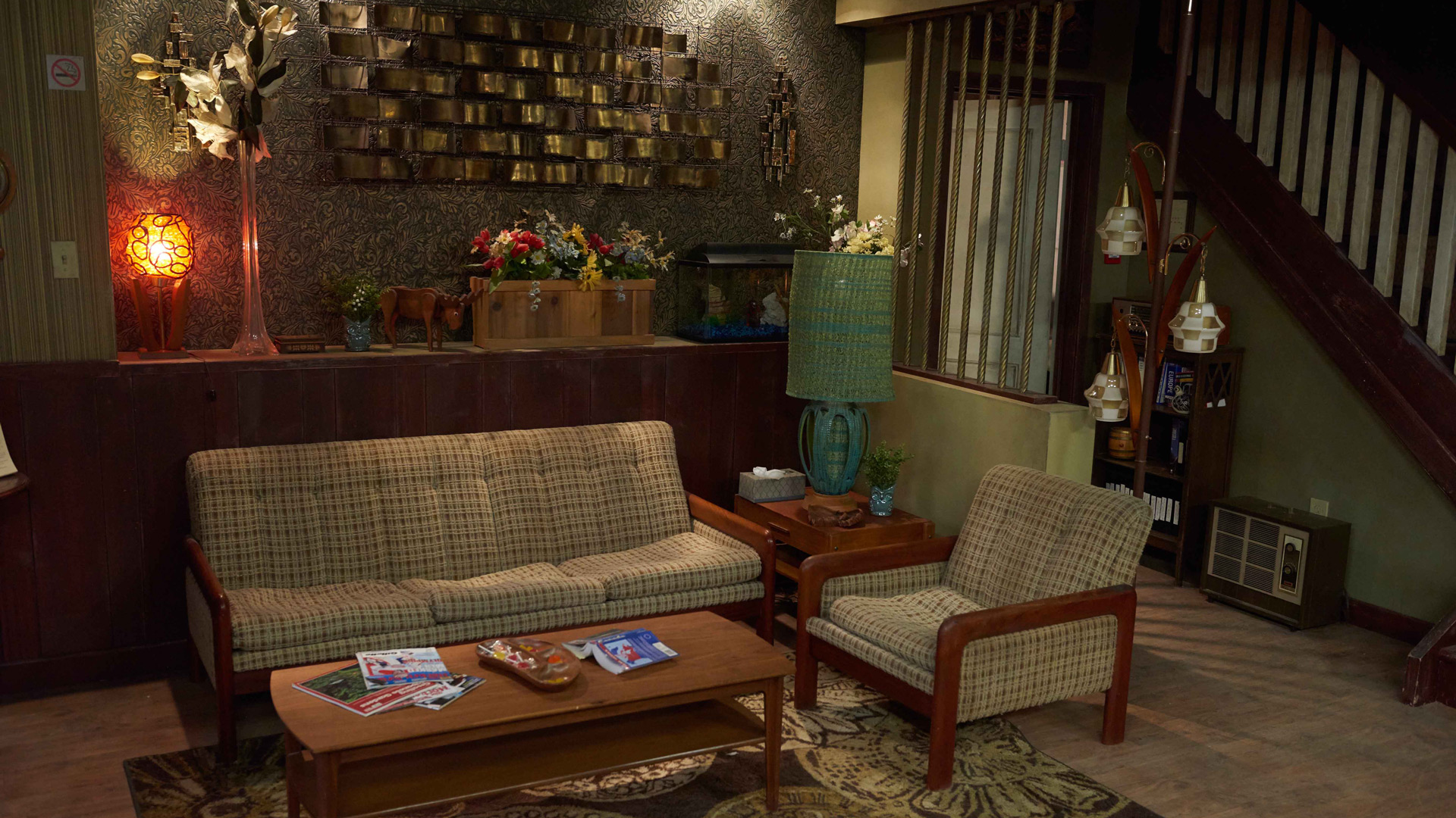 A warm, inviting living room scene with a modern couch and stylish coffee table bathed in soft, ambient lighting. The cozy interior creates a comfortable yet professional atmosphere, perfect for virtual meetings while maintaining a homey vibe. Suitable for home office enthusiasts.