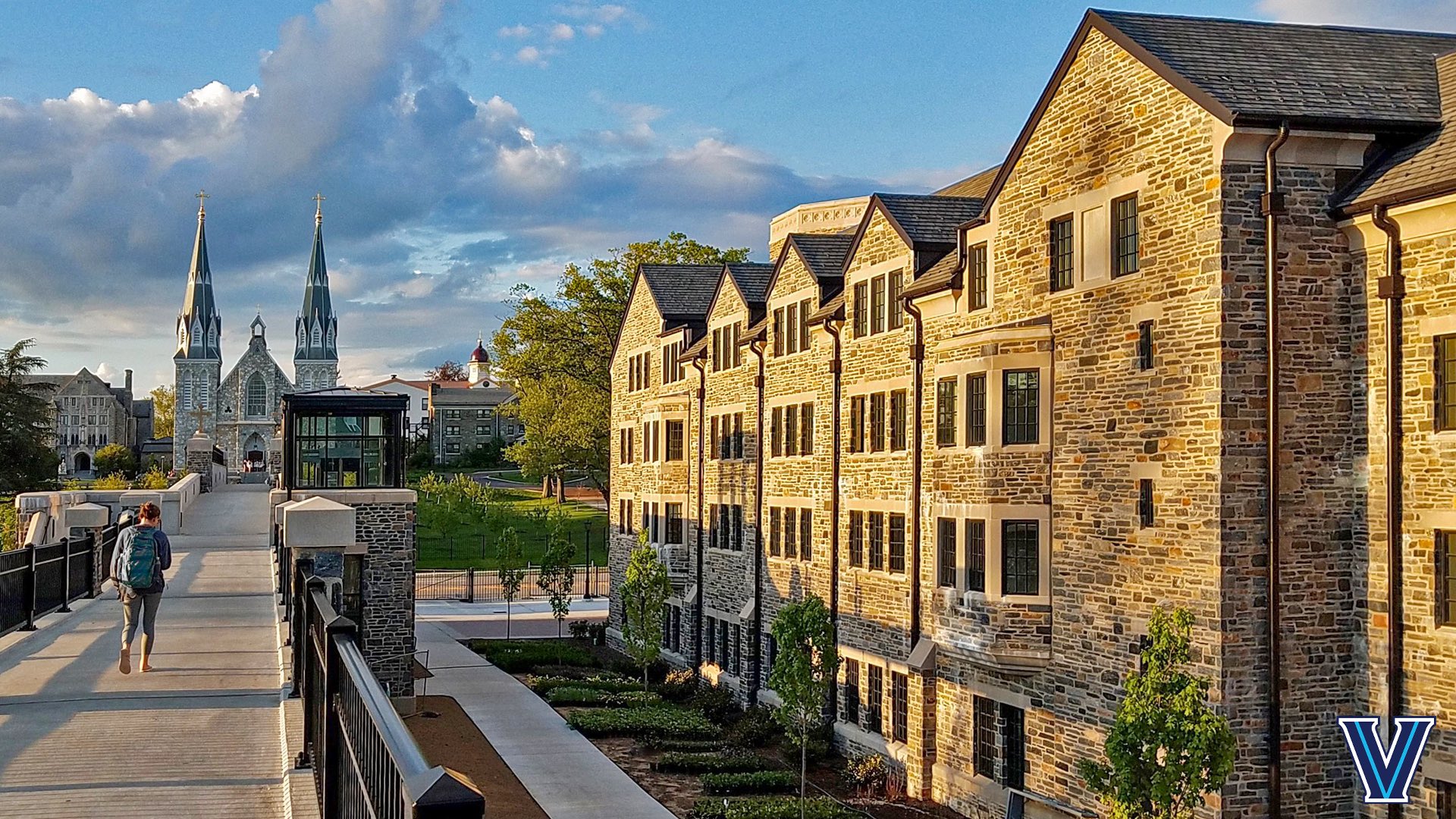 A historic Zoom background featuring a tranquil stone pathway winding toward a magnificent gothic church with soaring spires and intricate architecture, all illuminated by soft morning sunlight that casts gentle shadows across the scene. The peaceful campus setting evokes Villanova's rich heritage and scholarly atmosphere. Suitable for architecture and university heritage enthusiasts.
