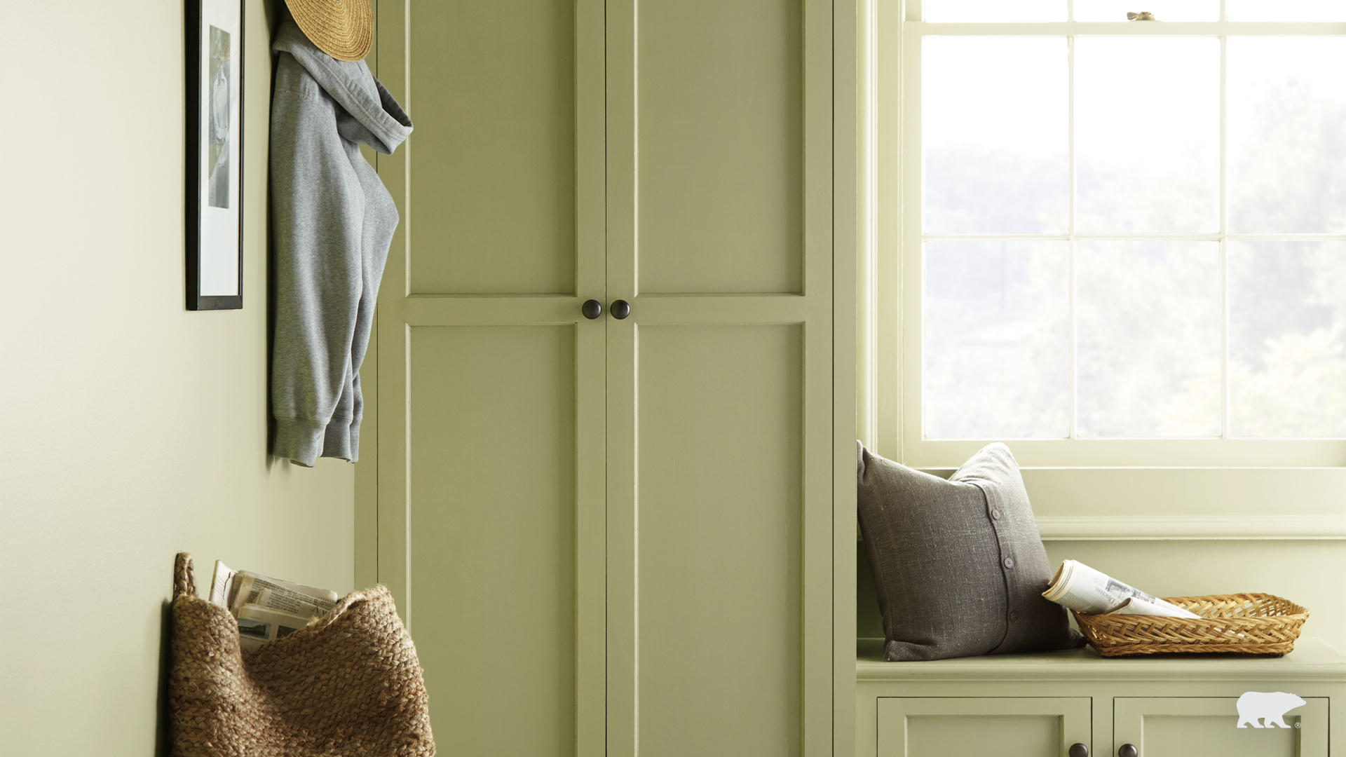 A sophisticated window seat nestled in a sunlit corner, featuring plush cushions and natural light streaming through elegant windows, creating a warm and inviting atmosphere with subtle BEHR paint tones on the walls. The cozy reading nook combines comfort with style, offering a glimpse of greenery beyond the glass. Suitable for home office enthusiasts.