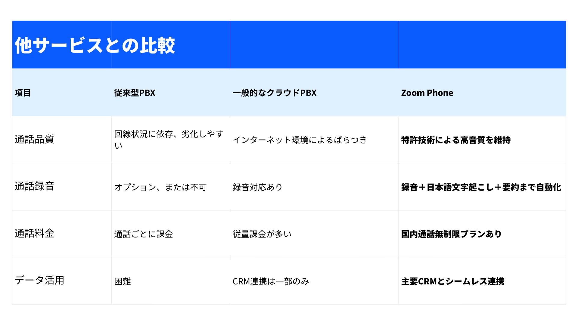 Zoom Phoneは、単なる電話システムではなく、電話文字起こしと要約機能を活用した業務効率化・情報活用のプラットフォームです。日本語対応の文字起こしにより、営業やカスタマーサポート、社内会議などあらゆるコミュニケーションを正確に記録し、議事録作成や情報共有の手間を大幅に削減できます。また、通話データをデジタル資産として活用することで、CRM連携や分析、ナレッジ共有など、組織全体の生産性向上にもつながります。さらに、高音質・コスト効率・柔軟な管理画面といったZoom Phoneならではの強みは、従来型PBXや他のクラウドPBXと比べても明確な優位性があります。
