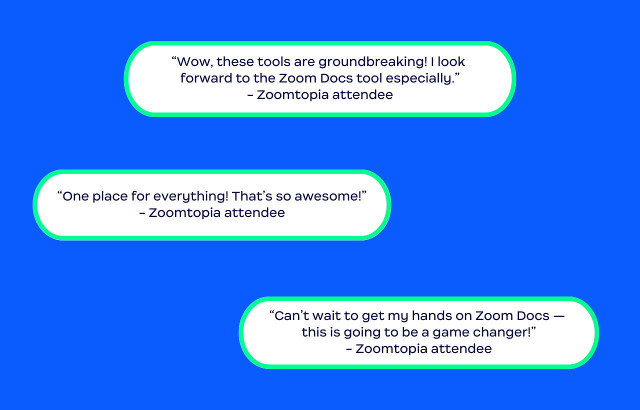 コラボレーションを強化するべく設計された Zoom の最新プロダクト、Zoom Docs を発表できたことはたいへん光栄です。このサービスはモジュール式の AI 搭載型ワークスペースで、2024 年にリリース予定です。皆様の日常業務をサポートする Zoom Docs のビジョンを共有したところ、皆様からは実に嬉しいリアクションをいただきました!