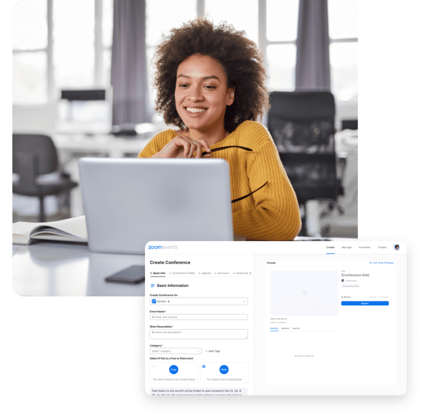 次回のバーチャル イベントは、ぜひ Zoom Events で主催してください。Zoom Events ライセンスを購入し、events.zoom.us にアクセスしてアカウントにサインインしてください。サインインするとすぐに、[管理] タブでハブのセットアップを開始できます。この後、[作成] タブで最初のイベント、サミット、またはカンファレンスの構築に着手できます。