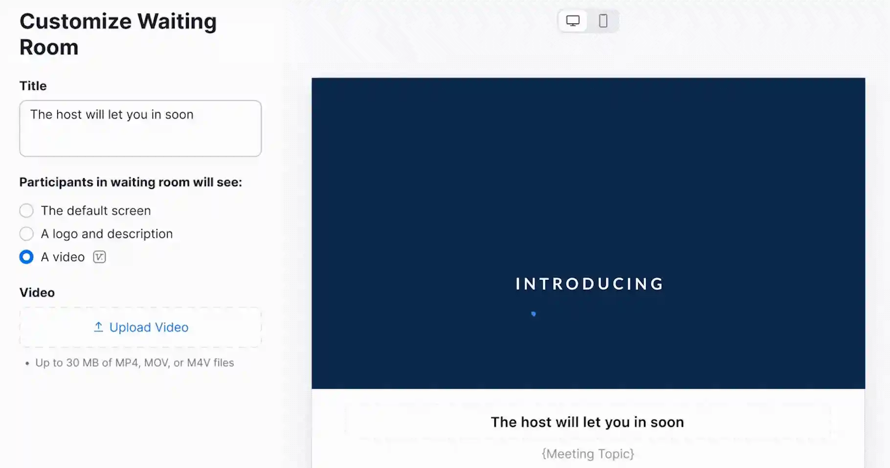 미팅 호스트는 Web Portal에서 미팅 대기실을 설정할 때 비디오를 추가할 수 있습니다. 대기실의 참가자는 호스트가 참가자의 미팅 참여를 승인할 때까지 기다리는 동안 비디오를 볼 수 있으므로 미팅이 시작되기 전에 중요한 정보를 원활하게 배포할 수 있습니다. 이 기능을 사용하려면 Client 버전 5.7.3 이상이 필요하며 모든 유료 계정에서 제공됩니다.
