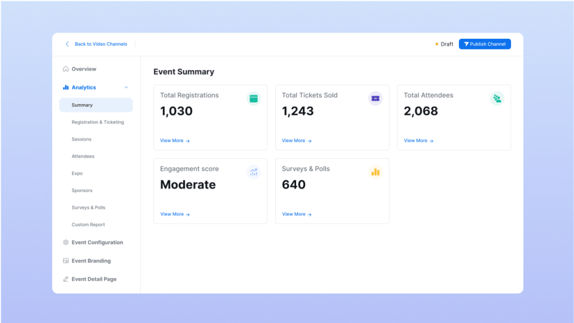 Van meerdaagse vergaderingen tot hybride beursvloeren, lever meeslepende evenementen die kunnen wedijveren met persoonlijke bijeenkomsten, zonder de beperkingen van de locatie.