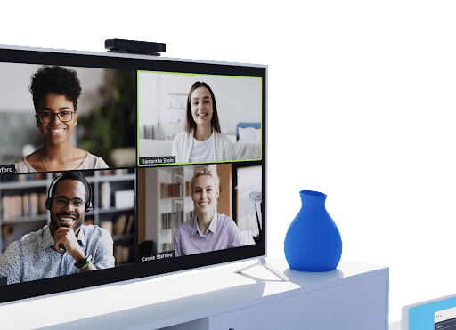 Zoom for Home-apparaten brengen uitzonderlijke vergaderervaringen rechtstreeks naar je externe kantoor of woonkamer. Dankzij de eenvoudige installatie en het beheer kun je meer tijd face-to-face met je team doorbrengen, zelfs als iedereen thuis is. Apparaten zoals de Facebook Portal TV, hier afgebeeld, kunnen zelfs je bestaande tv in een Zoom Room veranderen, zodat je met één druk op de knop kunt deelnemen aan vergaderingen.