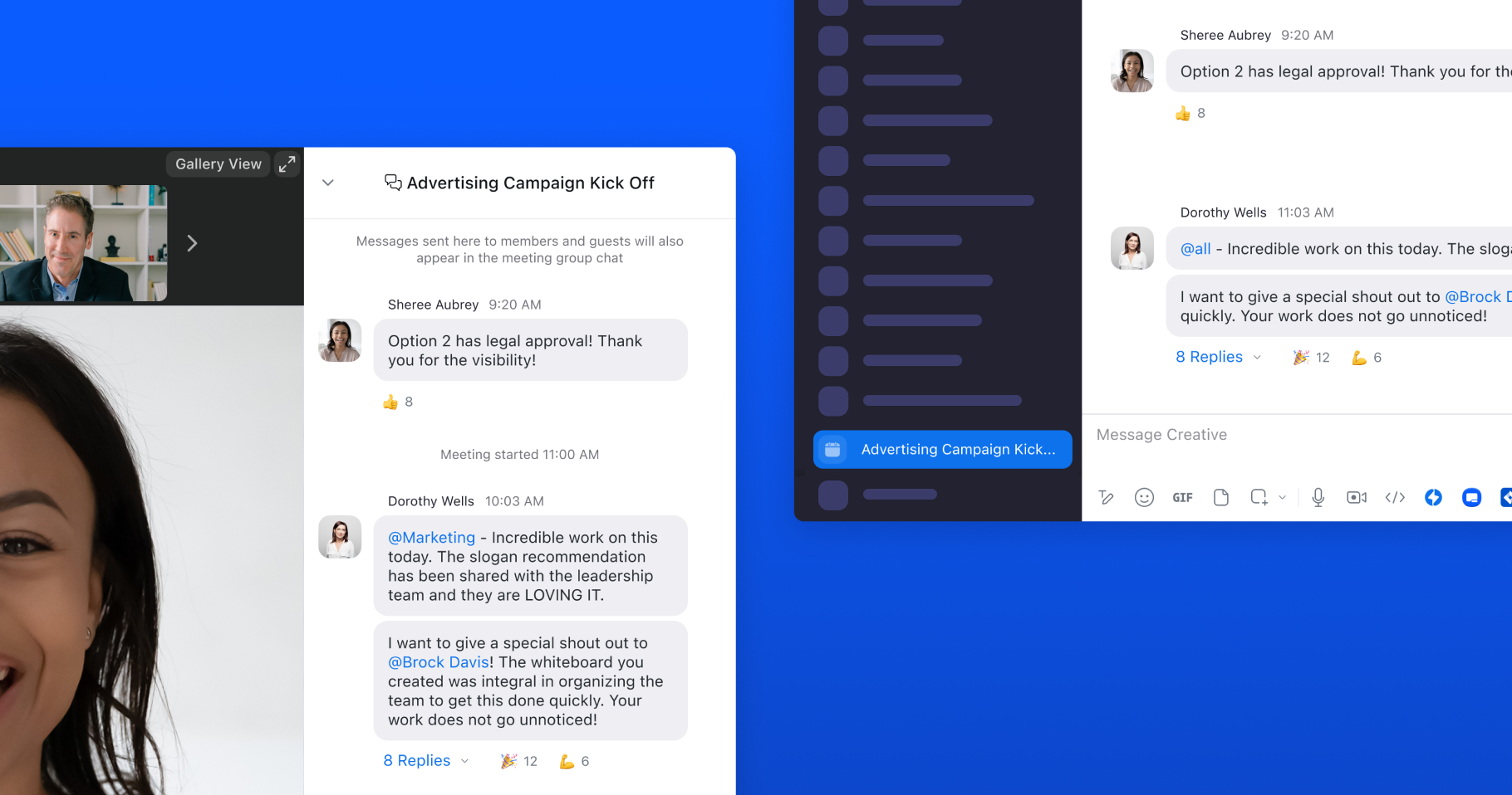 Ciągły czat spotkania łączy Cię również z bogactwem funkcji Zoom Team Chat. Możesz przełączać się między ciągłymi czatami spotkań, bieżącymi grupami i kanałami oraz rozmowami 1:1 w ramach jednej aplikacji.
