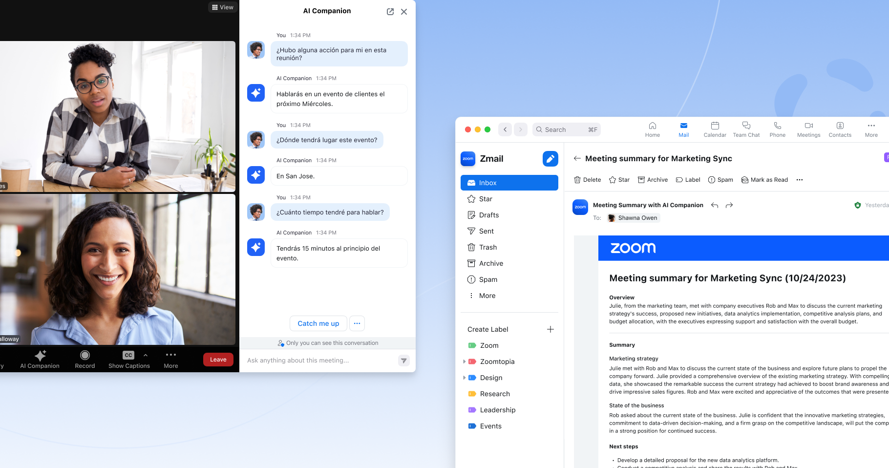 Tłumaczenie asystenta AI Companion w czasie rzeczywistym, wraz z możliwością otrzymywania podsumowań spotkań i zadawania pytań dotyczących spotkania w 33 różnych językach, pomaga zapewnić bardziej integracyjne środowisko dla globalnych zespołów. Ponadto zdolność asystenta AI Companion do automatycznego wykrywania języka mówionego podczas spotkania i generowania podsumowania spotkania lub odpowiadania na pytania dotyczące spotkania w tym języku (już wkrótce) jeszcze bardziej ułatwia zapewnianie wszystkim takich samych doświadczeń.