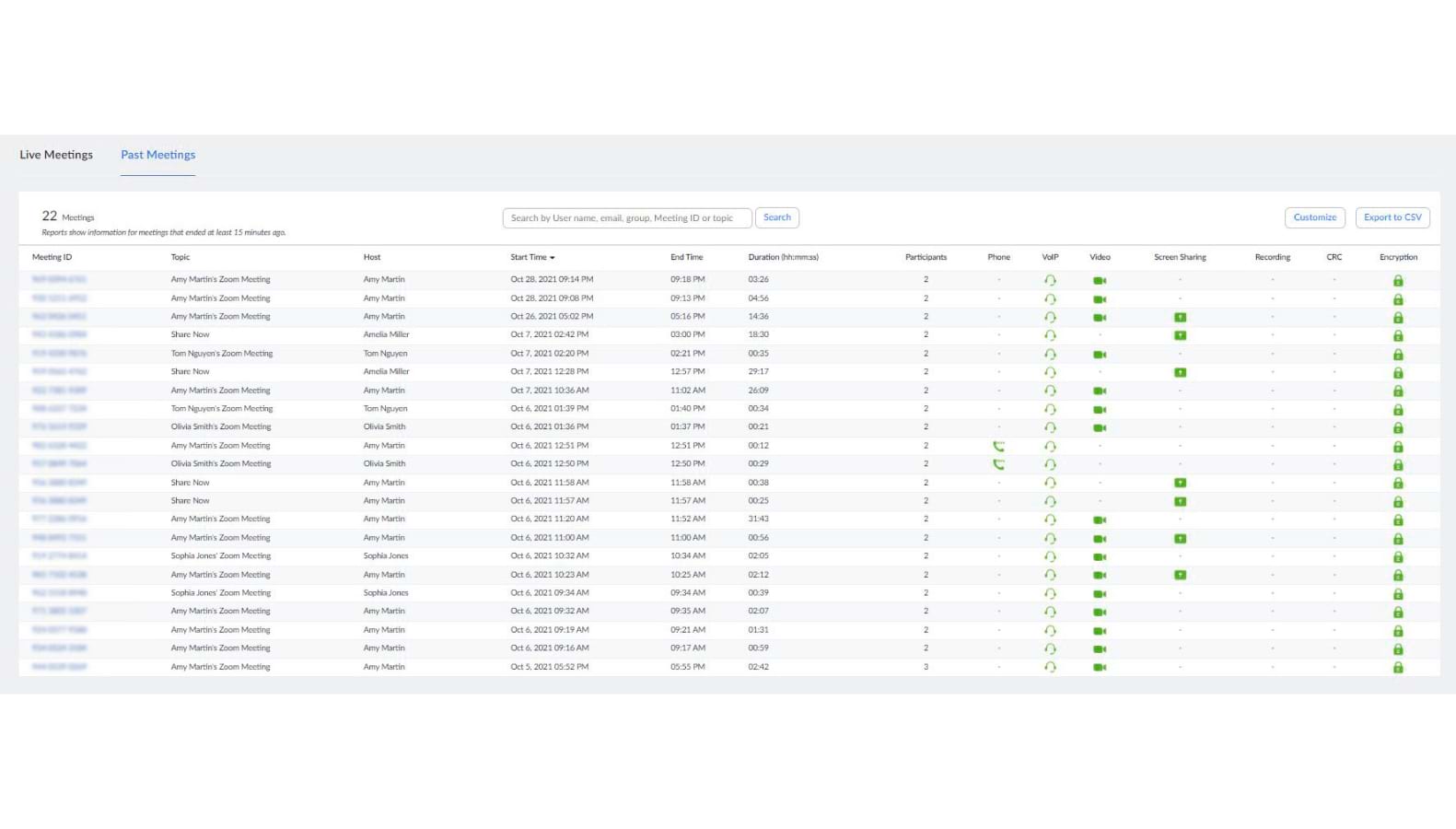Sprawdź jakość spotkań i webinarów (wynik w trybie MOS) według spotkań lub uczestników.