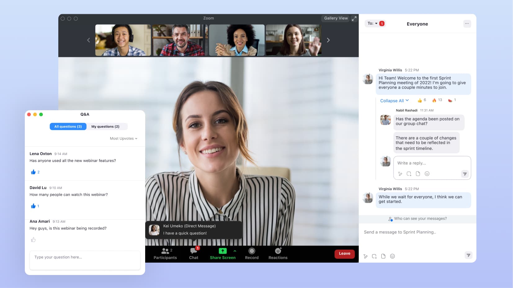 Eleve seus eventos com ferramentas de produção e galerias de público personalizáveis. Aumente o engajamento com enquetes, perguntas e respostas e atividades interativas.