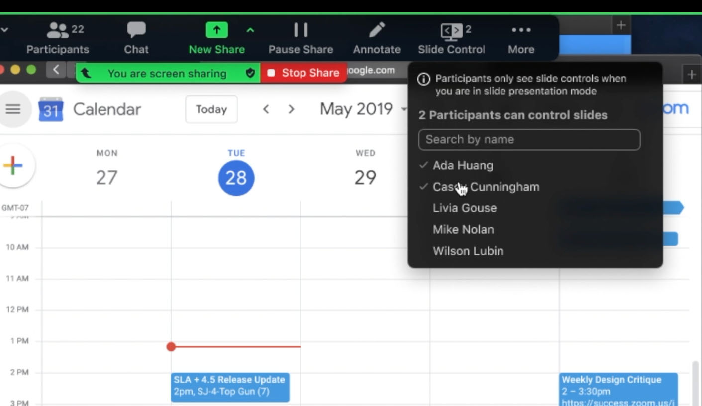 Поскольку докладчик не всегда самостоятельно управляет показом слайдов, теперь можно выбрать несколько пользователей для управления движением слайдов в презентации. Благодаря улучшениям в управлении слайдами докладчики больше не должны просить других присутствующих переключить слайд во время презентации, что повышает эффективность работы.
