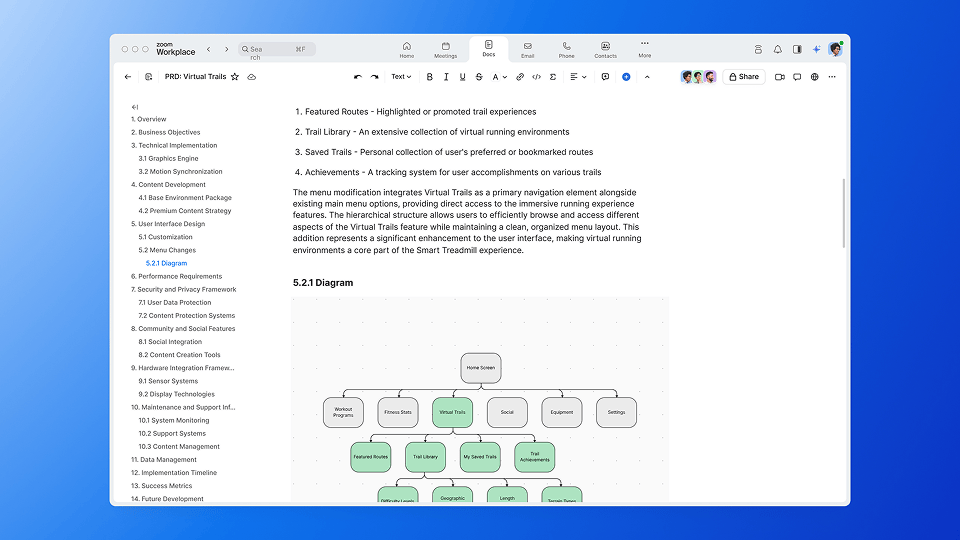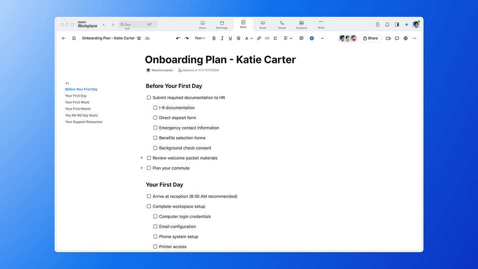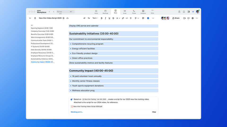 Обычные документы — дело прошлого. С помощью ИИ Zoom Docs может создавать из обсуждений вики-базы, таблицы, формы и прочие материалы, с которыми легко работать всей командой до, во время и после конференции.