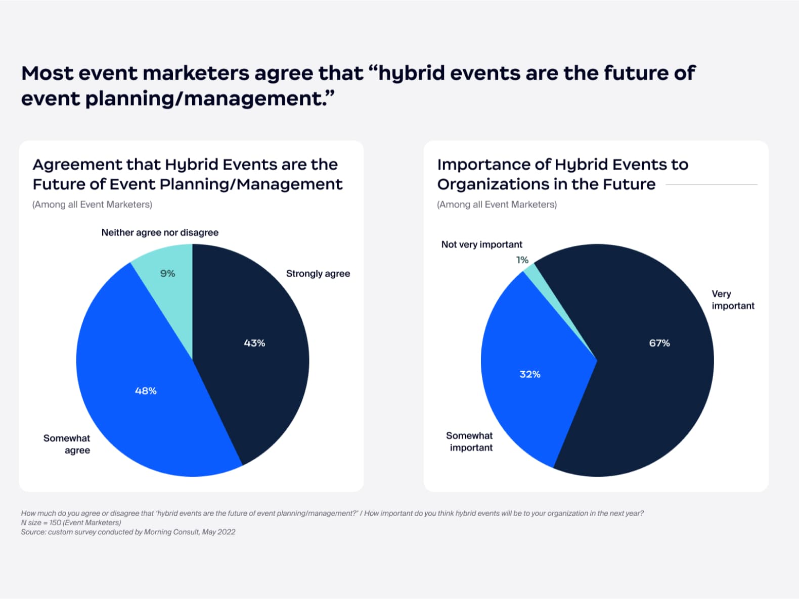 Hybridevenemangen har inte bara en plats i framtiden – de kommer att vara en permanent del av planeringsstrategierna för evenemang. Hela 89 % av evenemangsmarknadsförarna håller med om att hybridevenemang är viktiga för organisationer och 91 % tror att de kommer att spela en viktig roll i framtiden.