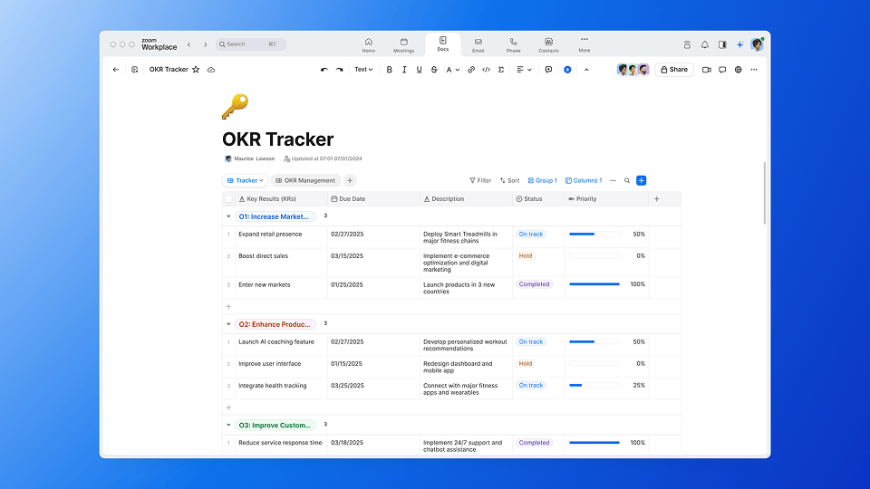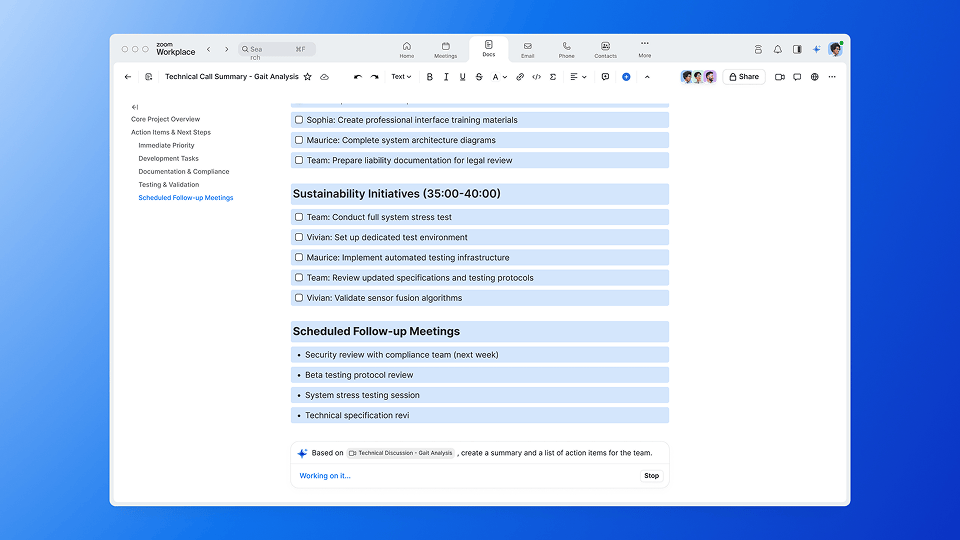 Eski belgeler geçmişte takılı kalmış. Zoom Docs, yapay zekayı kullanarak tartışmaları paylaşılabilir belgelere, wiki'lere, tablolara ve formlara dönüştürür, böylece ekibiniz her toplantıdan önce, toplantı sırasında ve toplantıdan sonra daha iyi iş birliği yapabilir.