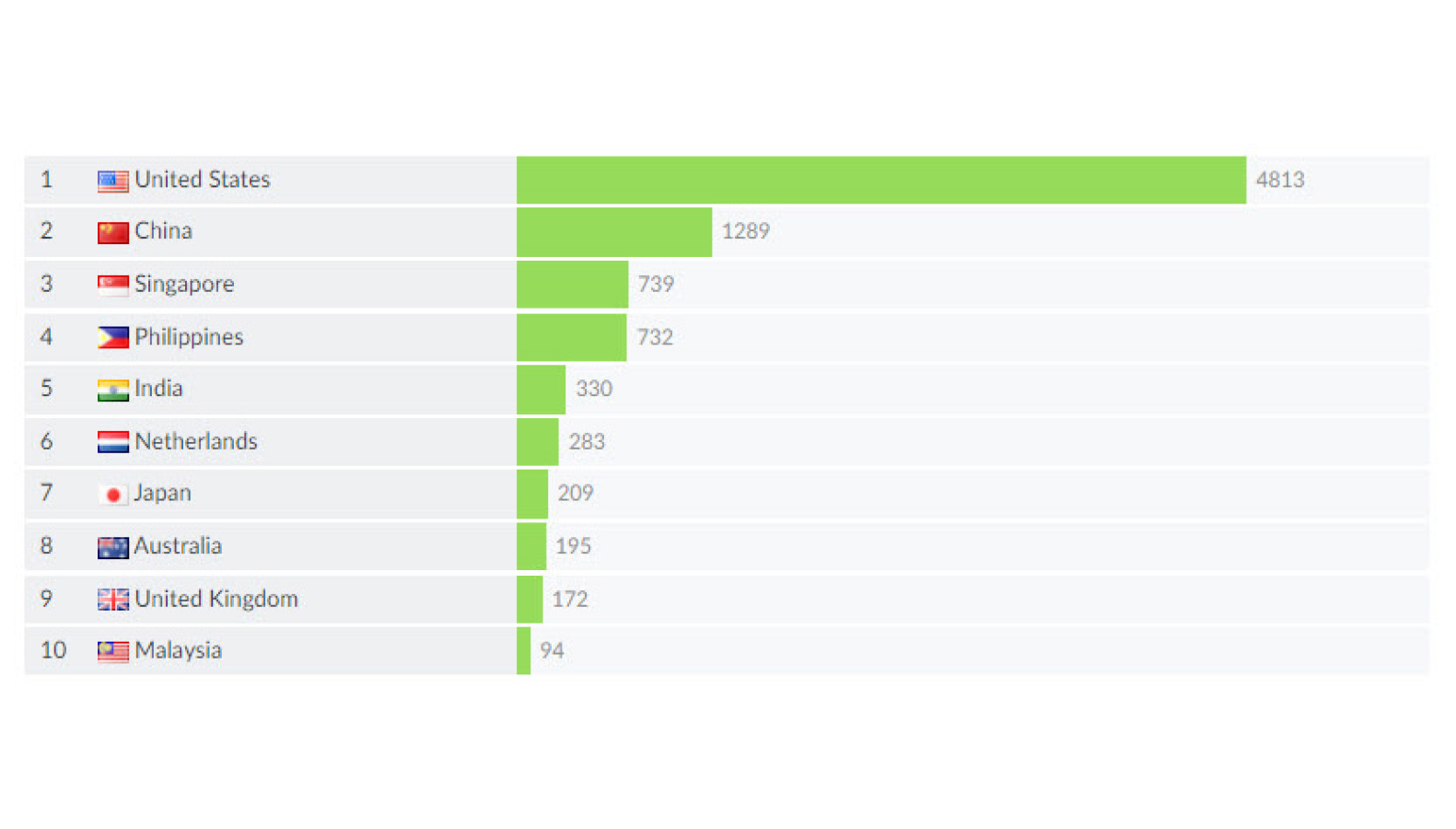 查看 Zoom Team Chat 使用情况(按排名前 10 的国家/地区排序)。